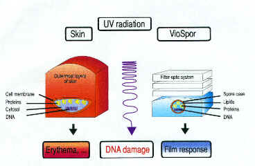 The UV-filtering effect of the outermost layers of skin functions as a filter system The generation of erythema by skin cells containing DNA is simulated as a film response by the immobilized spores AA